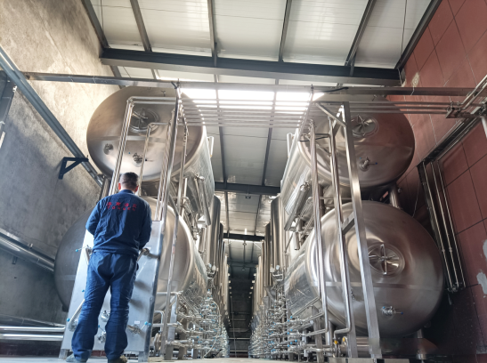 啤酒廠(chǎng)為5000L糖化系統,為糖化罐+過(guò)濾槽+煮沸罐+旋沉槽+熱水罐的組合形式,配粉碎機、斗式提升機、輸送機、麥汁平衡罐、 酒花過(guò)濾罐、麥糟輸送機等輔助設備。每天釀造批次最大可達6批次。一期客戶(hù)配置的是10000L的發(fā)酵罐和清酒罐,以及臥式清酒罐。